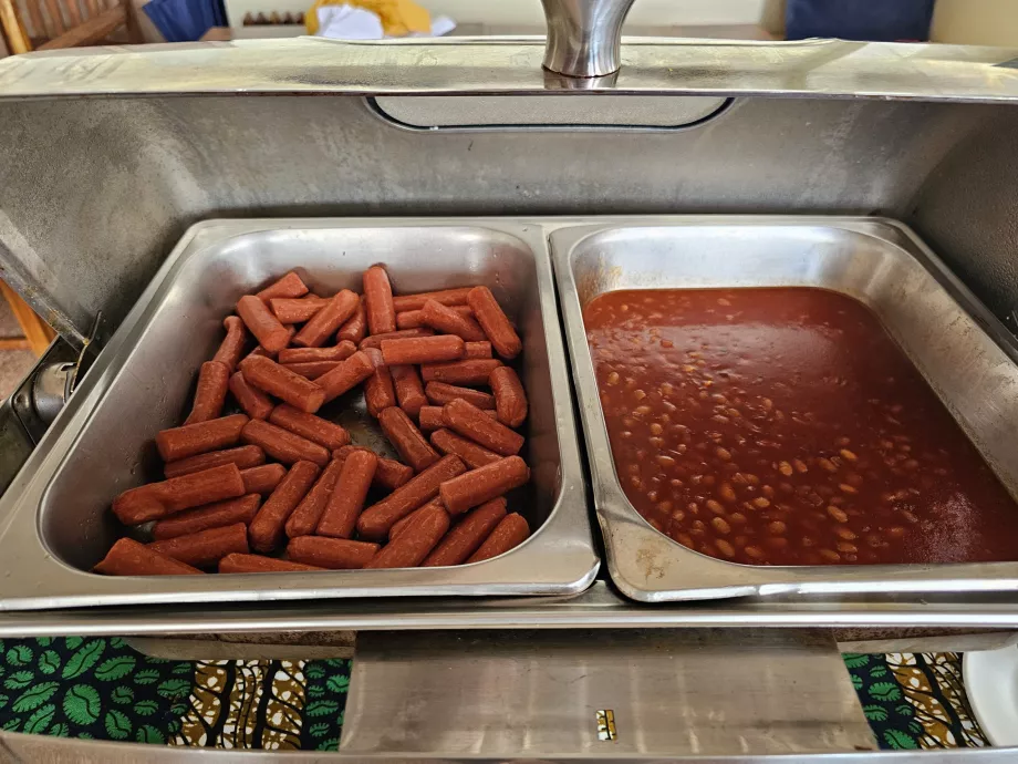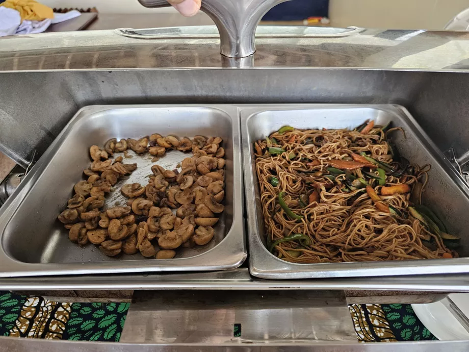Háromféle meleg étel közül lehet választani - többnyire tészta vagy rizs, nagyon rossz minőségű kolbász, chapati palacsinta vagy más helyi sütemények, főtt zöldségek, bab vagy gomba.