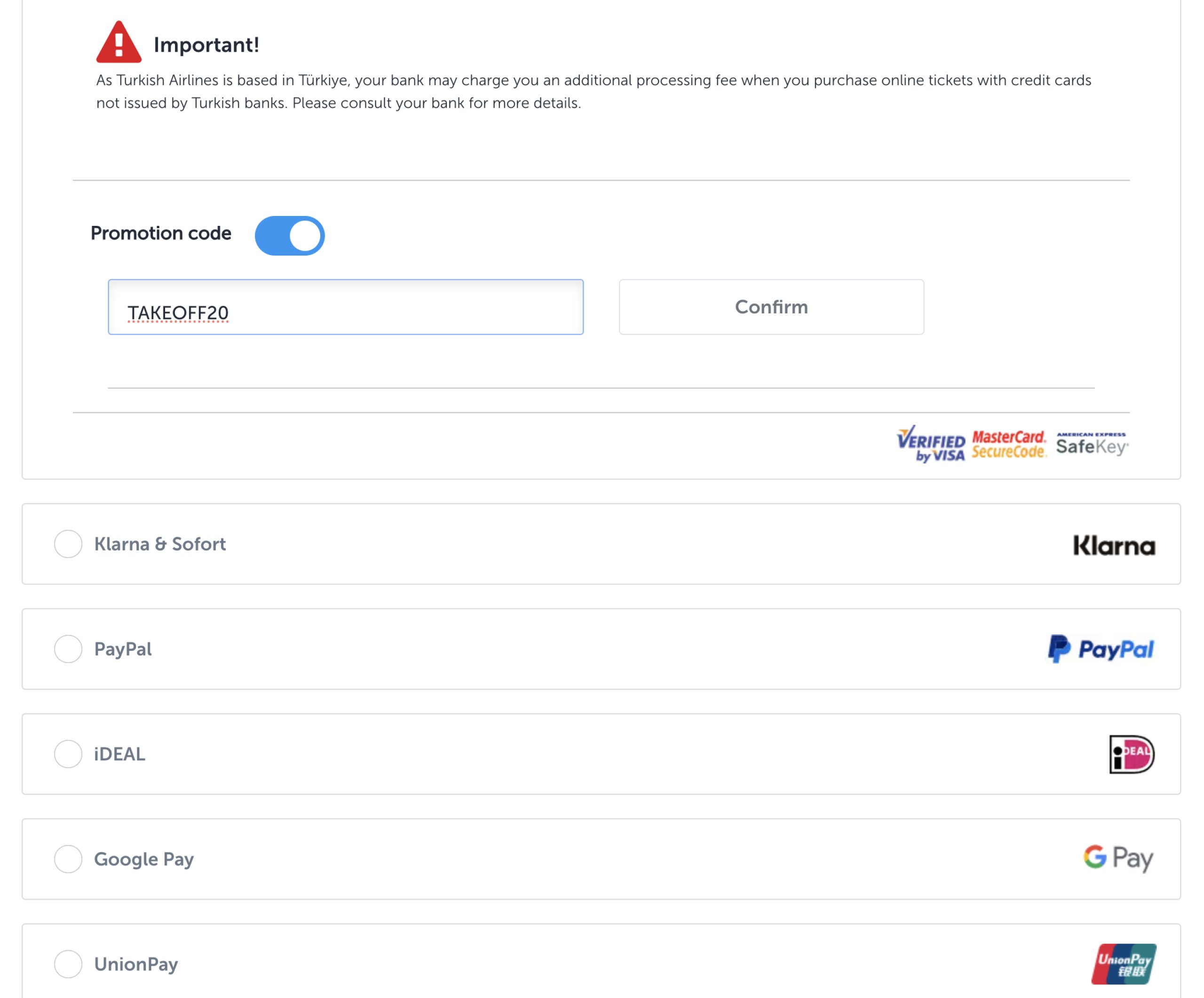A Turkish Airlines promóciós kódot a végső pénztár oldalon tudja alkalmazni.