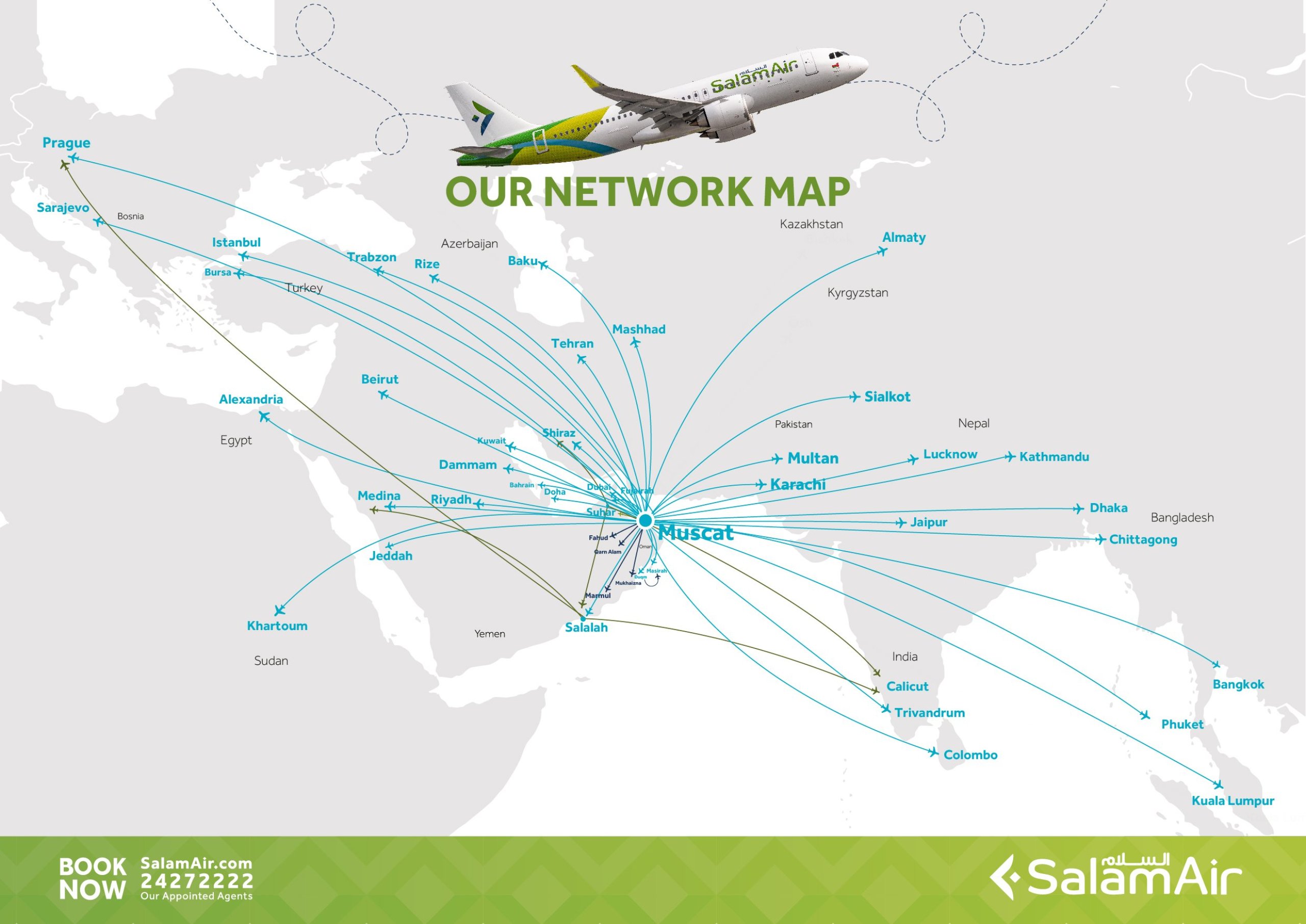 A SalamAir kevesebb mint egy tucatnyi, főként a délnyugat- és közép-ázsiai régióban található célállomásra üzemeltet menetrend szerinti járatokat. Az úti célok között azonban olyan európai városok is szerepelnek, mint Prága, Szarajevó és Isztambul. A SalamAir kínálatában a legfontosabb célállomások a következők: