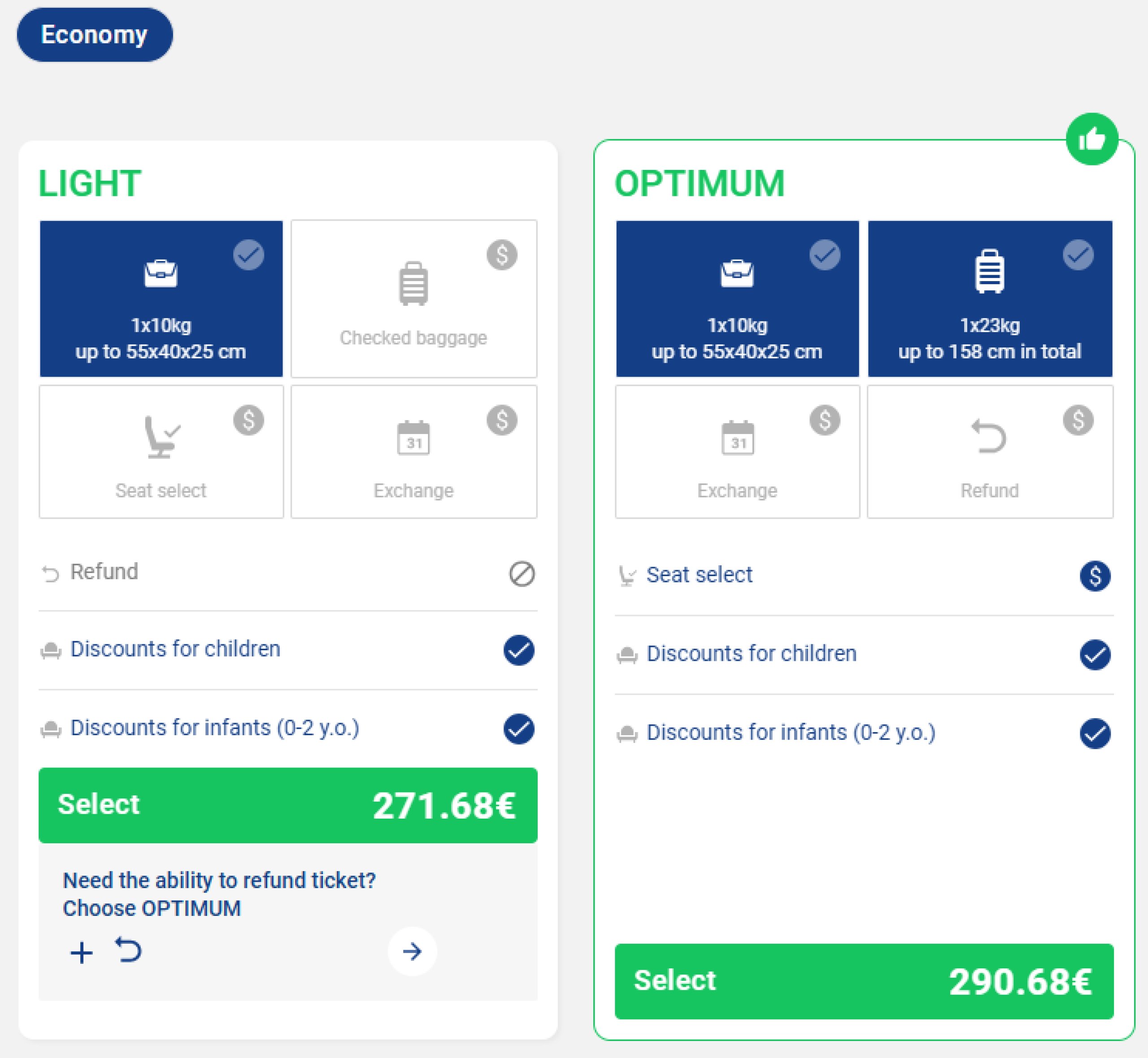 - Optimum - Kézipoggyász és feladott poggyász 23 kg-ig, helyválasztás díj ellenében, módosítás és törlés díj ellenében lehetséges.