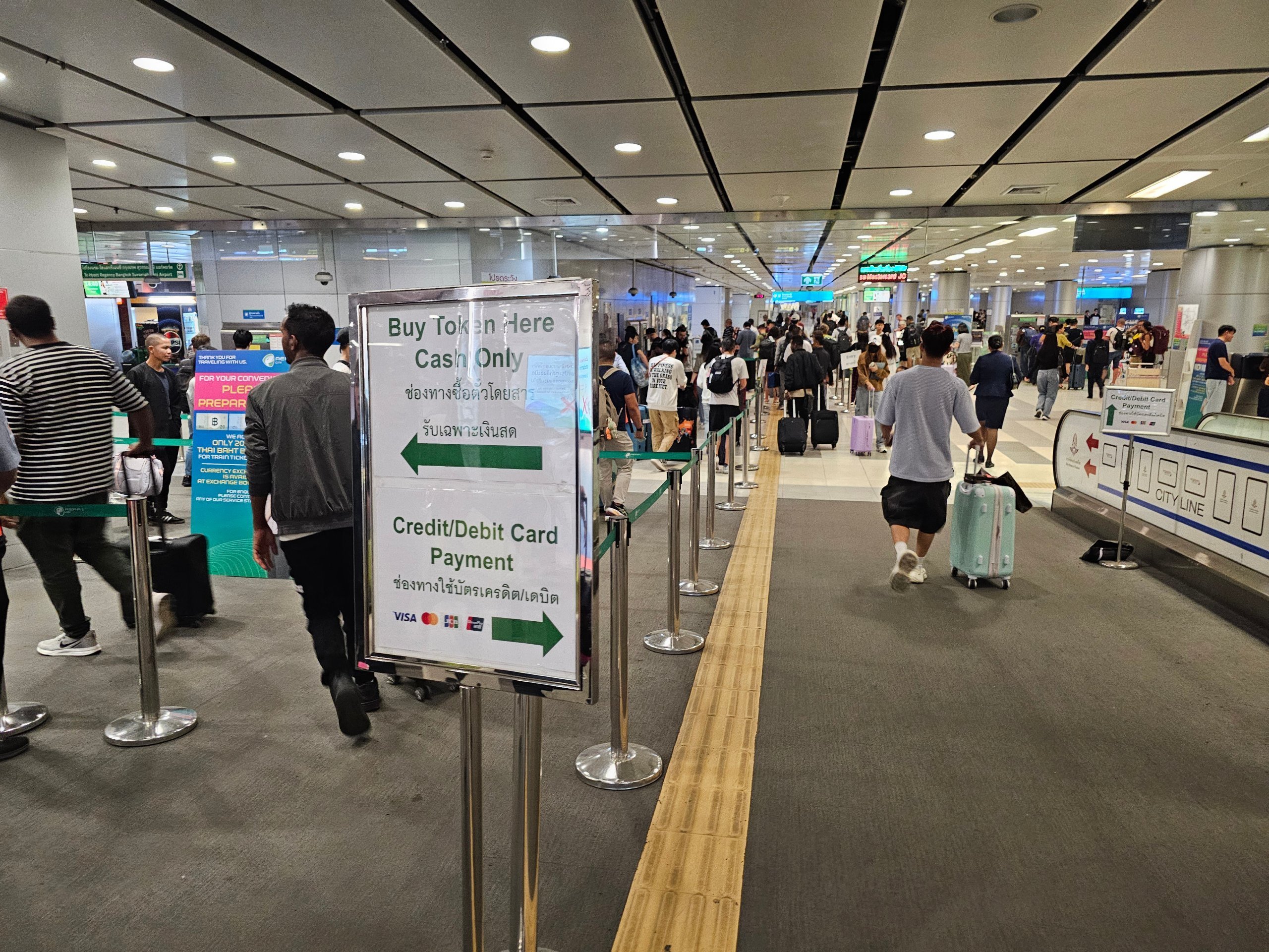 Ez csak készpénzzel lehetséges (az automata 100 thb-ig fogad el bankjegyeket). Kapsz egy műanyag tokent, amelyet "bepipálsz" a forgóajtónál (a tokenben egy chip van), és leszálláskor bedobod a forgóajtónál.