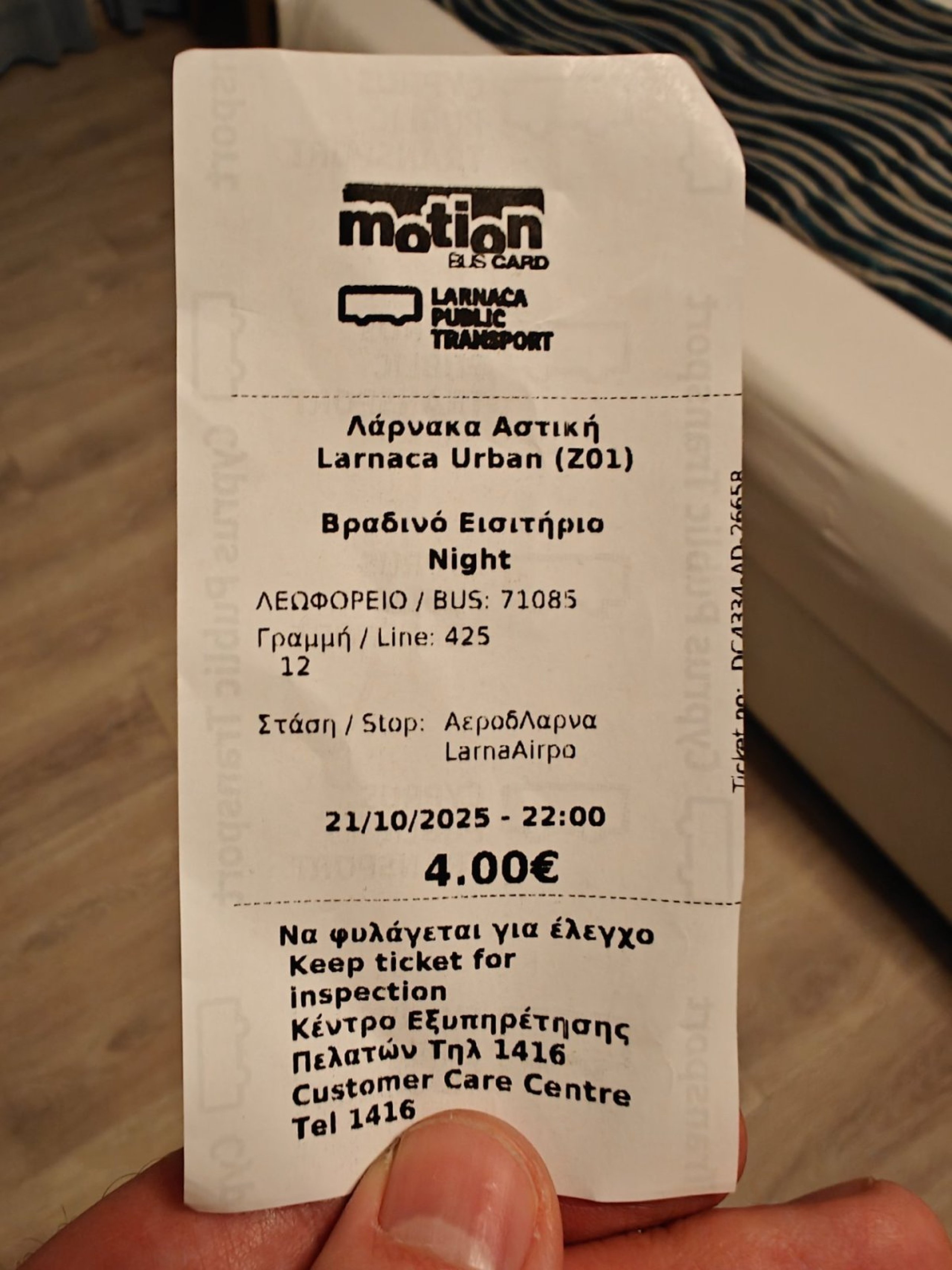 - 2,40 eur - 1 utazás bárhová a larnacai tömegközlekedésen (nem átszállójegy).