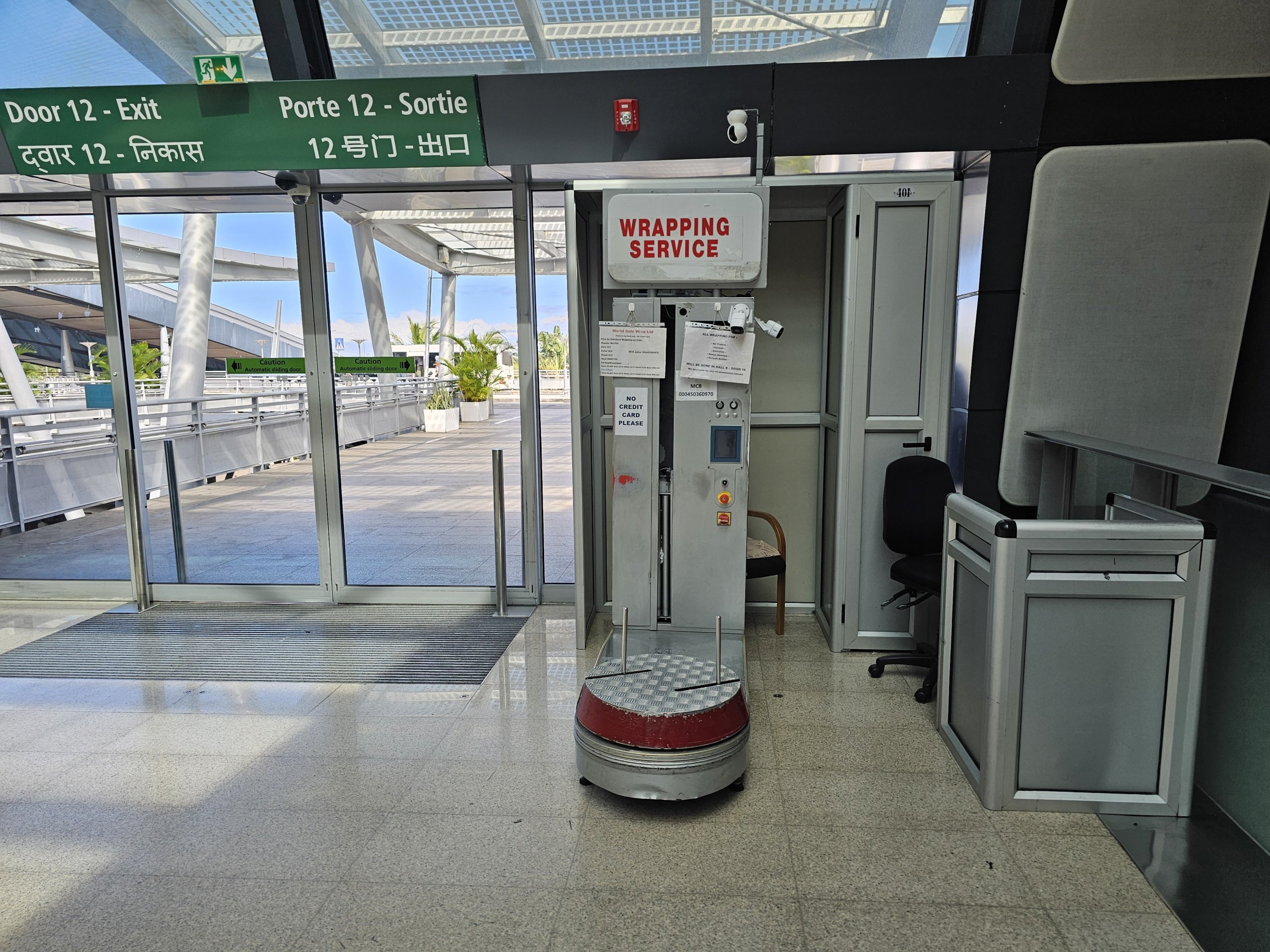 Az indulási csarnokban több kioszk is van, ahol 300 murért védőfóliába csomagoltathatod a poggyászodat.