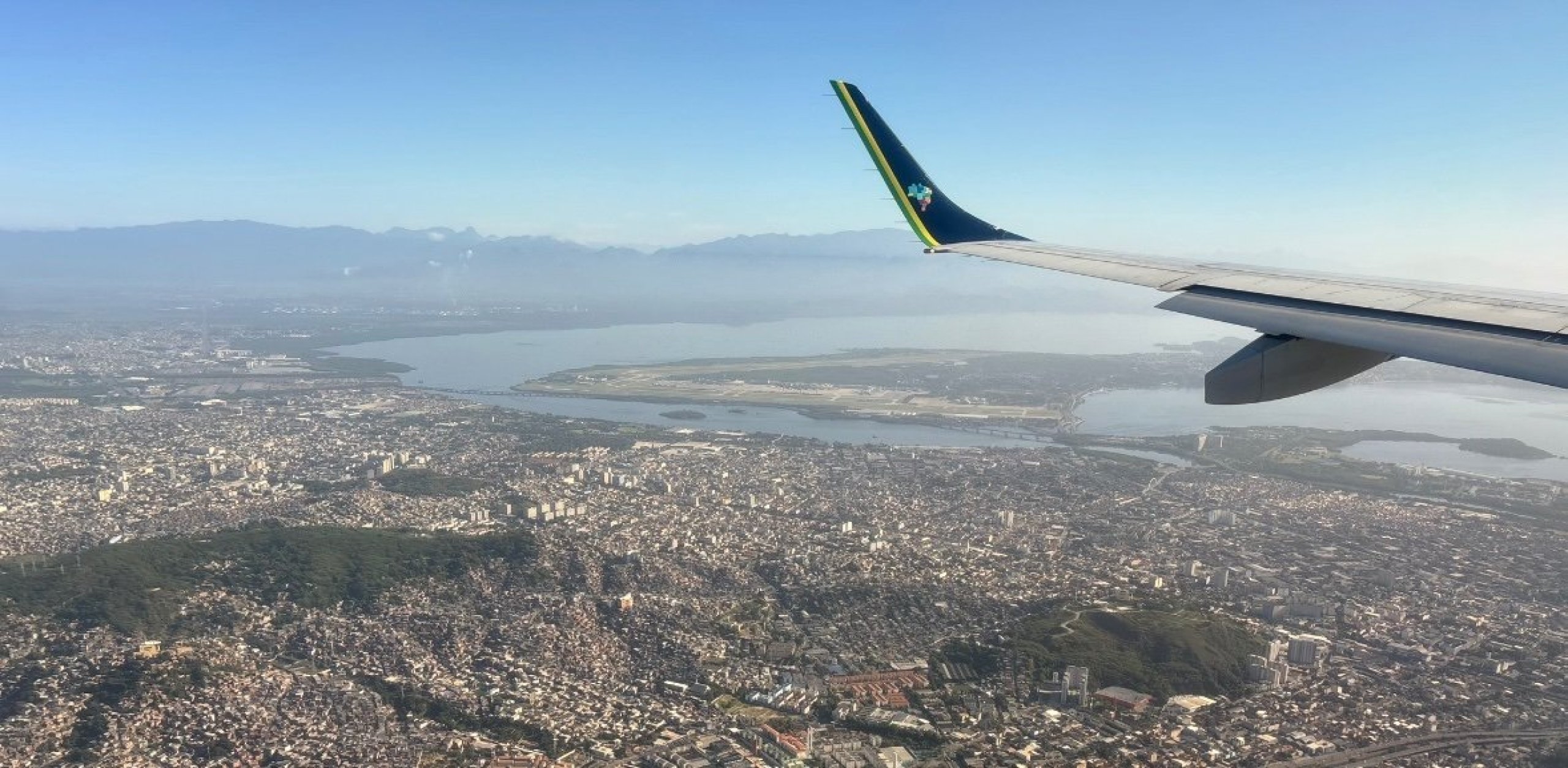 Az Ilha do Governador-i Galeão repülőtér látványa az Azul Linhas Aéreas Embraer-195-ös repülőgépével közlekedő GRU-SDU járat alatt.
